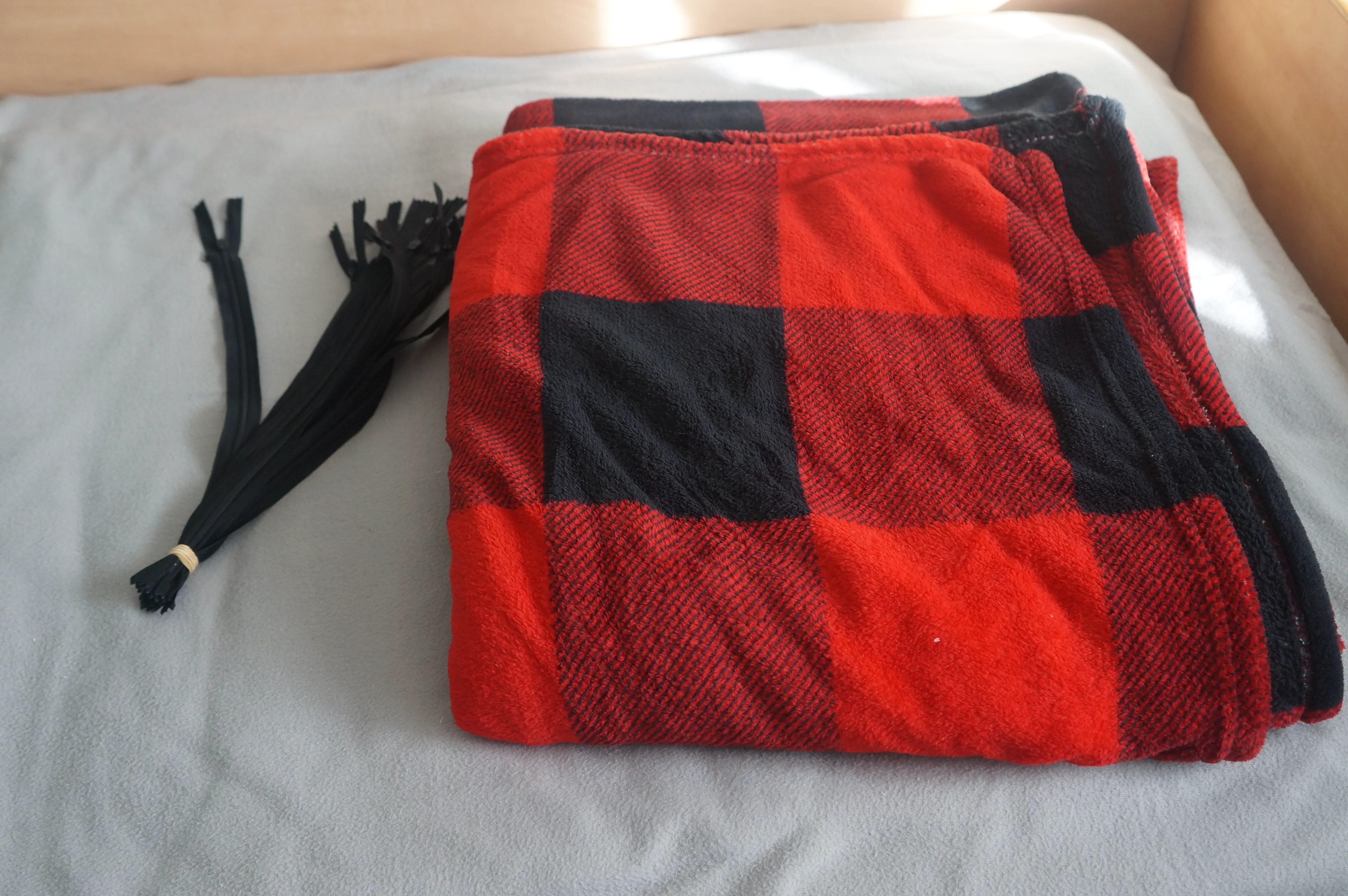 Имелся плед, который не подошёл по размерам. Имелись потайные молнии (в закромах)
