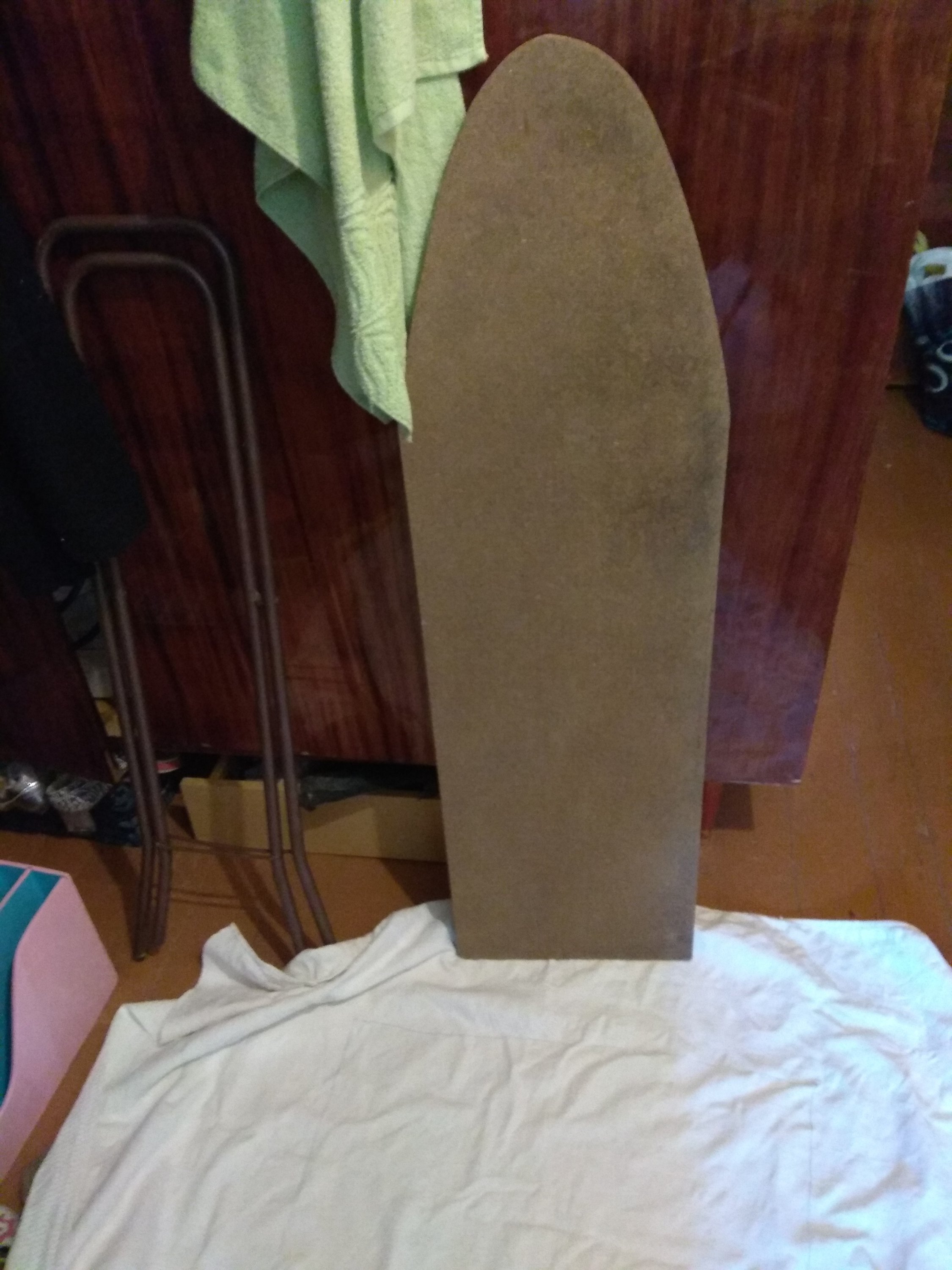 3. Отреставрировала свою гладильную доску. Разобрала, покрасила ножки, перенесла креплени (чтобы повыше была, а то вечно в сгорбленной состоянии гладила, низко мне было). Гладилка год назад спасена с мусорки :D обтянула старым покрывалом, снизу для мягкости два слоя полотенца (поролона или ватина не было :unsure:)