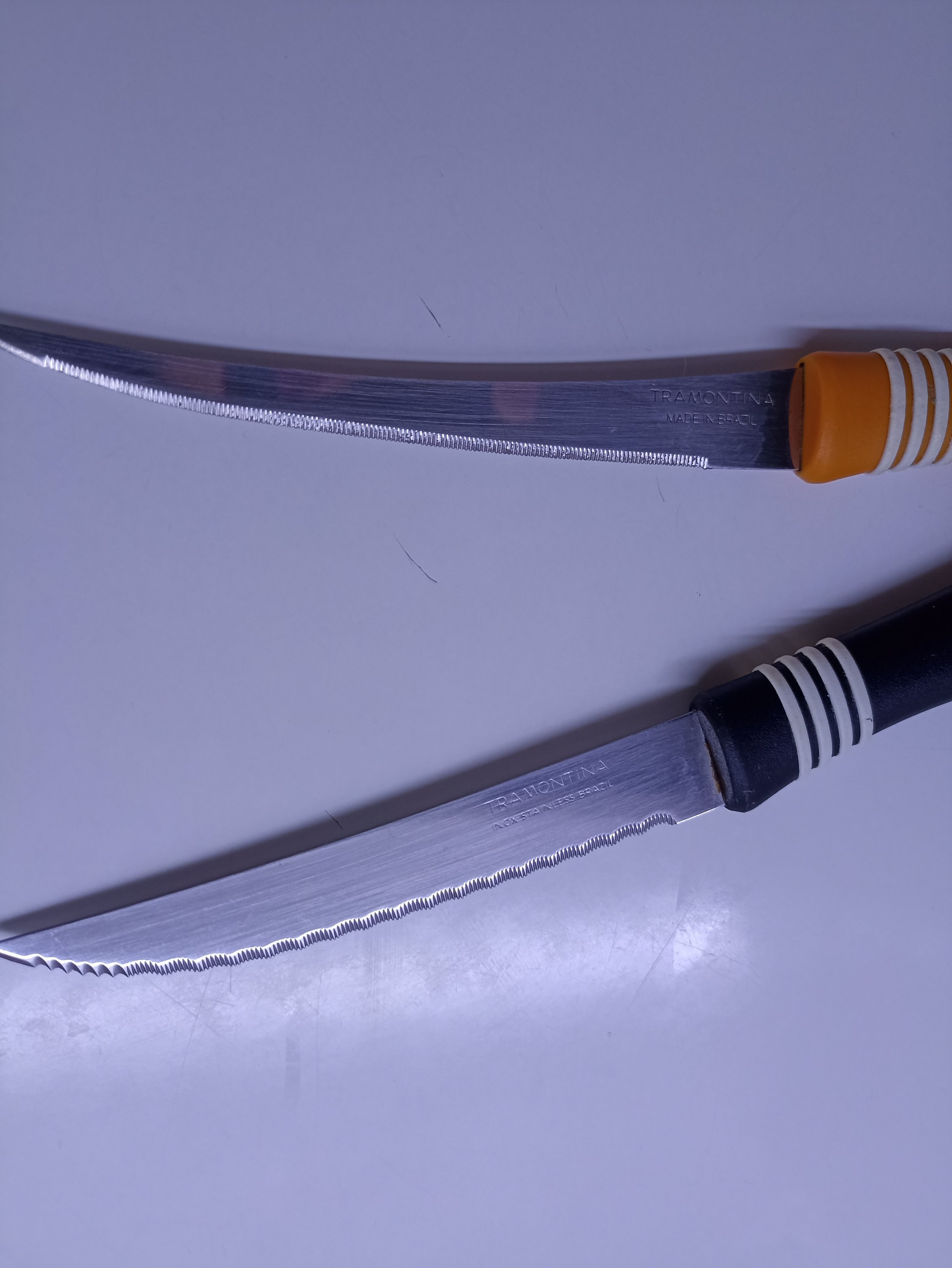 Я периодично болею, то часами, то ножами, то еще чем нибудь, болею тяжело, до фанатизма, ножами я болел примерно года 2-3 назад, читал, пытался вникнуть, выбирал-покупал, точил, покупал точилки, купил как-то псевдо японию нож Самура, почему псевдо, ну спецы на ганзе провели расследование, и выяснили что ножи делают либо в России, либо в Китае, но нож хороший, сталь AUS 8, если взять помидор, поднять его на высоту 10 см и уронить на нож, то помидор легко поделится на 2 ровные половинки, так же можно подкинуть кусок газеты и разрезать его на лету, нож конечно же должен быть хорошо наточен, потом я стал выздоравливать, к ножам болезнь прошла, режу тем что попадется под руку, иногда затачиваю на дешманской заточке фискер свои ножи(спецы не кидайте камни) а в обиходе чаще всего пользуюсь вот таким ножом, как говорится и в пир и в мир, и в добрые люди, универсальный трамонтина, стоит копейки, если картошку чистить, то есть у нас нож Труд вача, отличная сталь, для чистки картошки идеально.