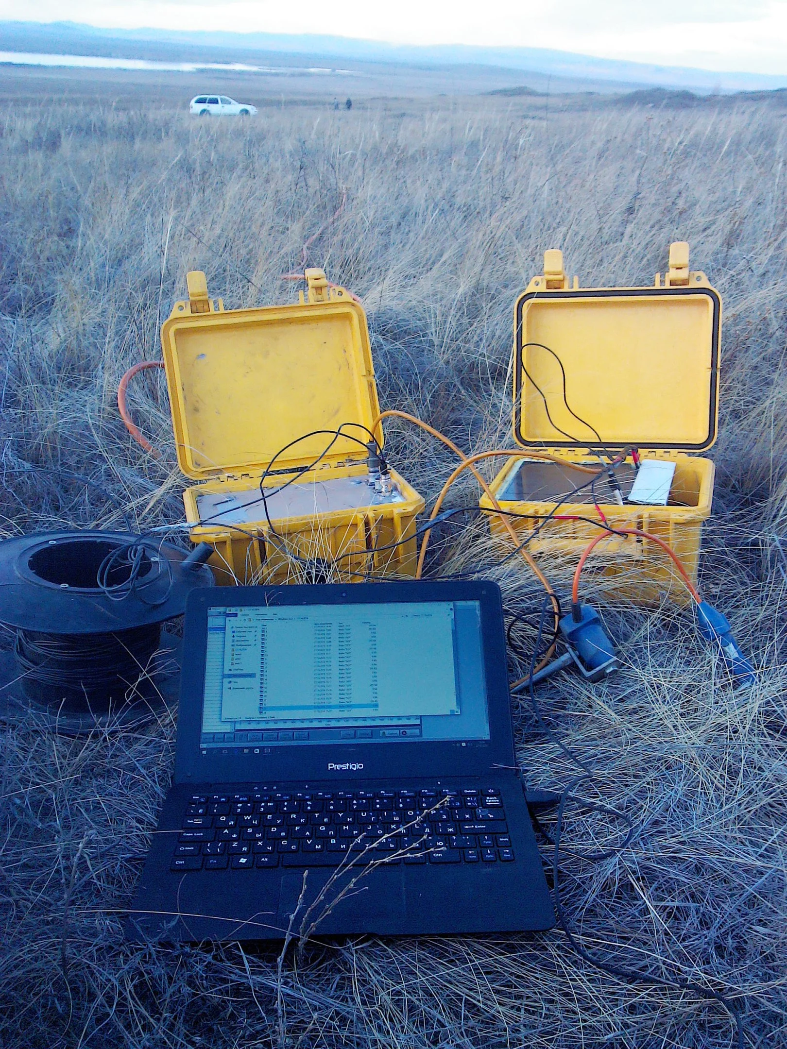 Там коса (провод), через каждые пять метров на ней коннектор. К нему цепляешь датчик, другим концом датчик втыкаешь в землю. Всего по косе 24 датчика. Коса 120 метров. Возле каждого датчика нужно простучать. Когда стучишь - волна идет по земле, отражается и возращается обратно. Разные грунты по разному волну проводят, соответственно отстучав по прямой больше сотни метров у тебя перед глазами полный профиль того, что есть под землей, как грунт идет, какие дырки подземные есть и так далее.