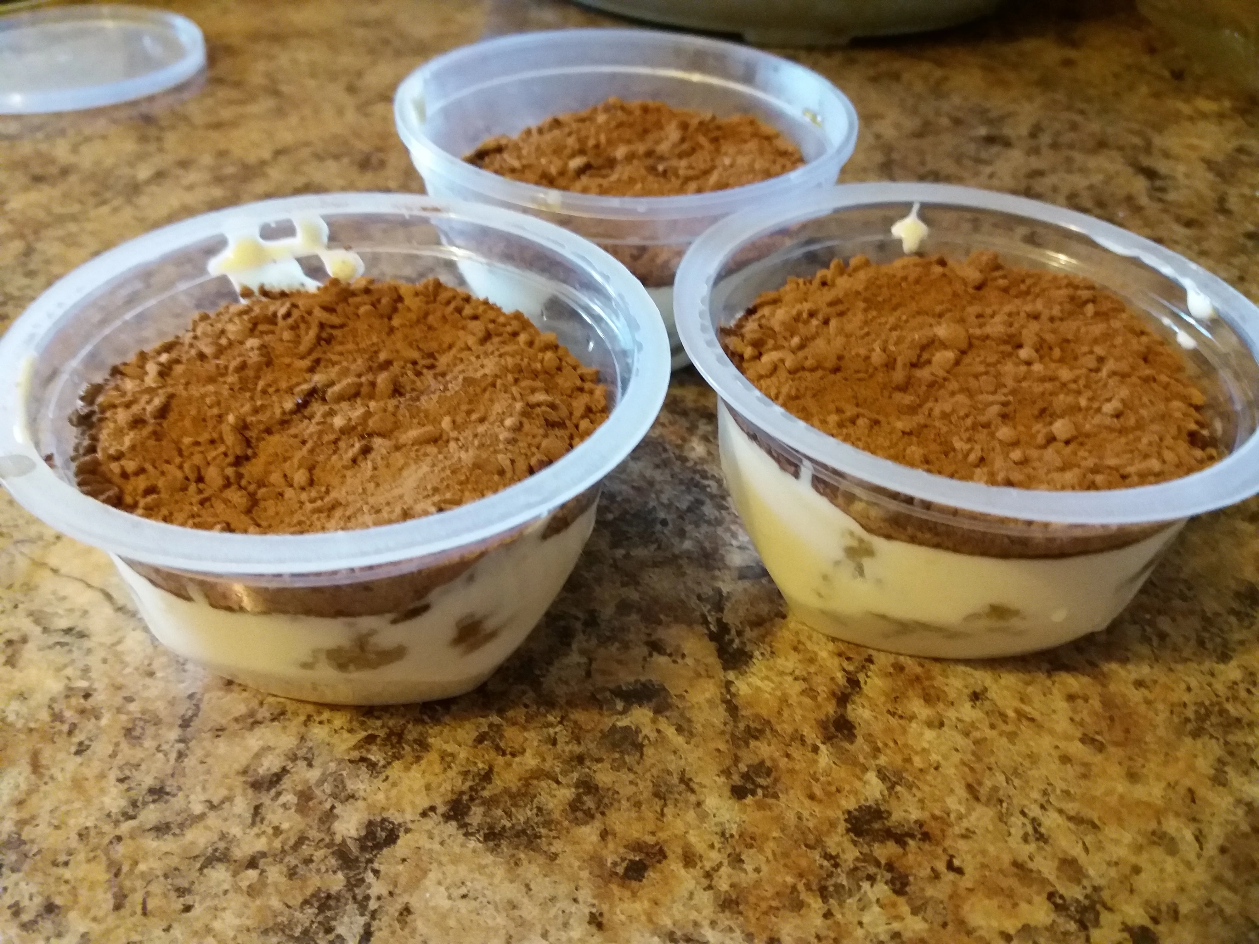 5. Собираем пироженое - в креманку выложить 1/2 части твороженного крема, части коржа обмокнуть в кофе и на крем, затем выложить оставшийся крем