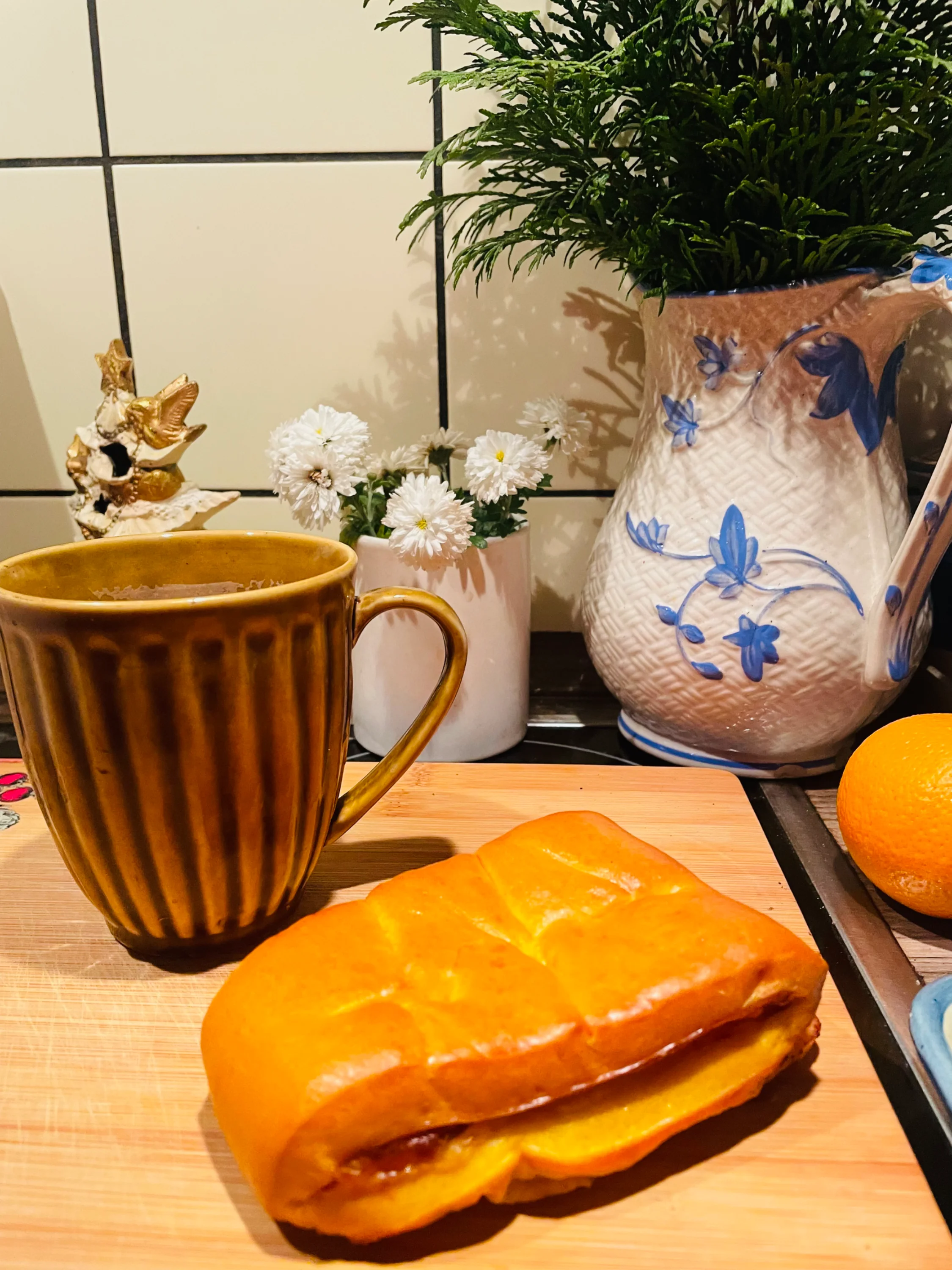 Вот ещё теплые горничные оттенки . Тоже люблю . И чтоб природы кусочек , елочки и голубого ( на кувшине ) . С ромашки напоминают что зима пройдёт и будет снова весна .