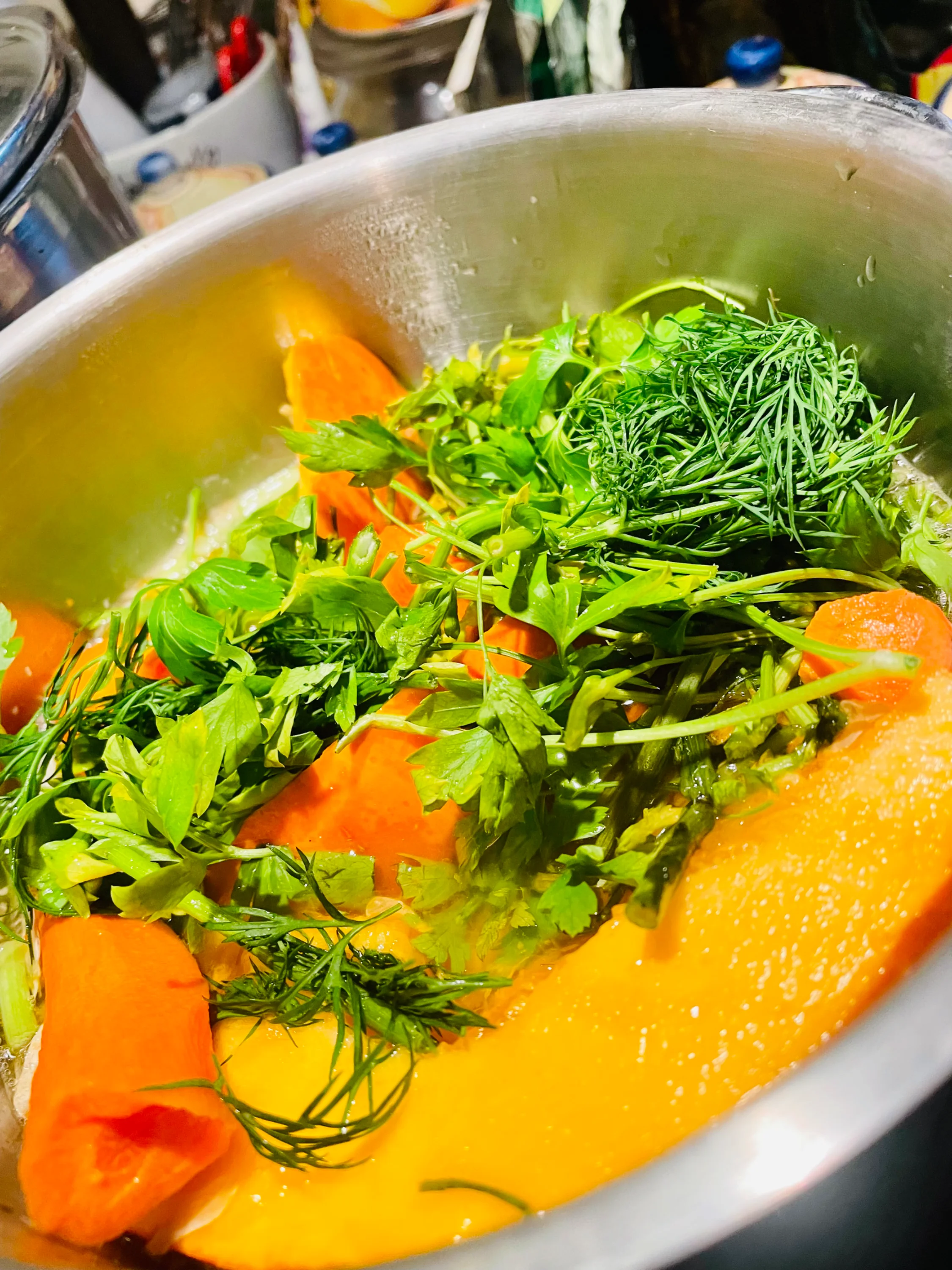 Суп из тыквы , моркови , кинзы , сельдерея корня и свежей петрушки -укропа