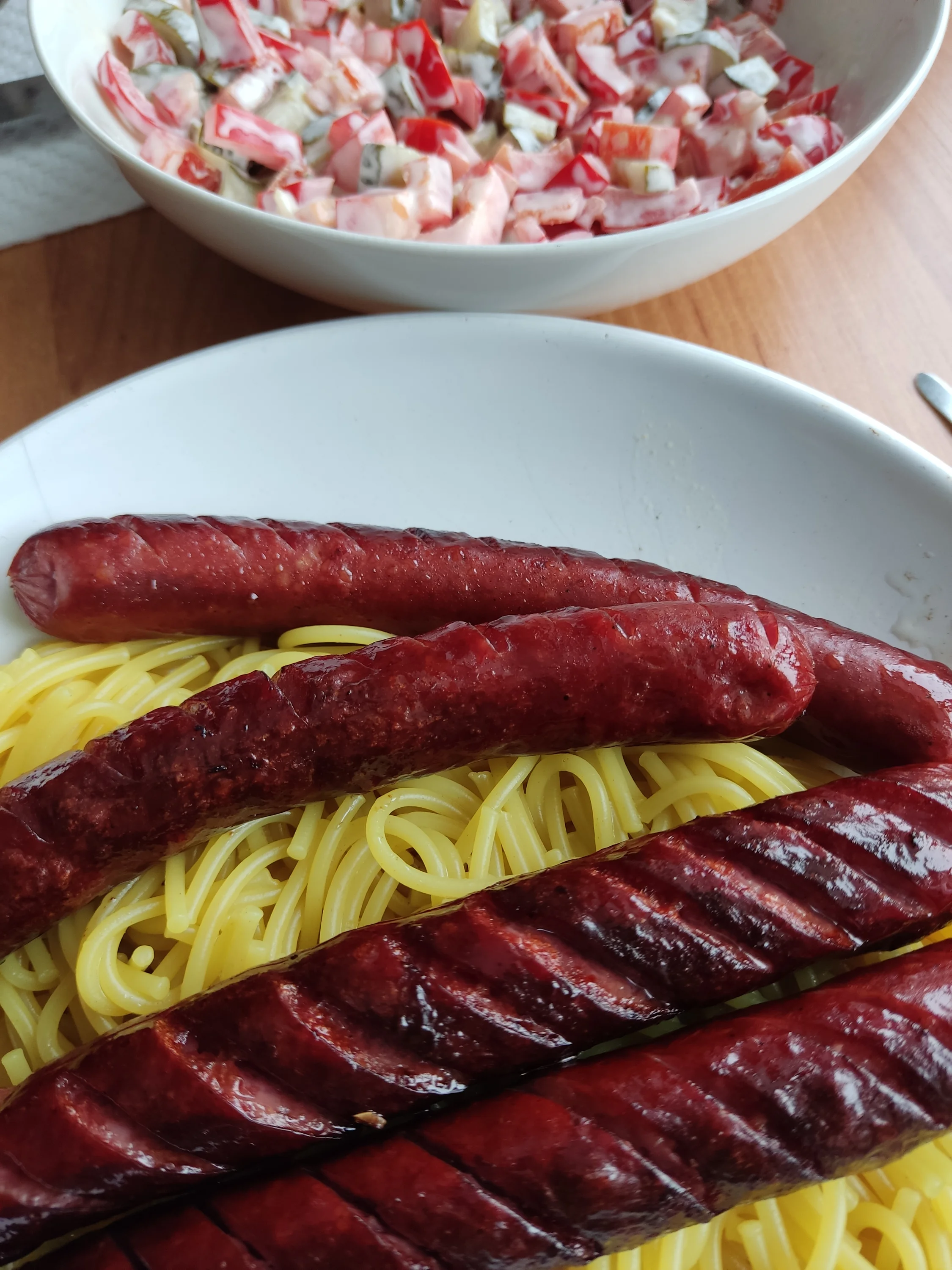 Захотелось жаренного и острого, охотничьи колбаски и салат из маринованных огурцов со сладким перцем и майонезом с горчицей, чеснок.