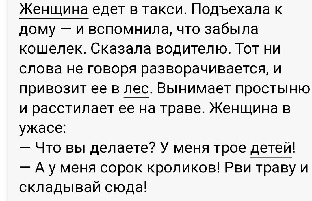 Приходит кролик в публичный дом. Ему говорят: - Сейчас никого нет. Только старая удавиха! Ну, кролик почесал репу, думает: " - Экзотика! Я согласен. Заходит в комнату, удавиха один глаз открывает и думает: "Клиент или обед? Обед или клиент?" Взяла и проглотила его...Через пять минут думает: "А вдруг клиент - тогда от хозяина таких люлей выгребу...". Взяла и выплюнула. Кролик вылетает, отряхивается и восхищённо орёт: - Вот это ми*ет!!!