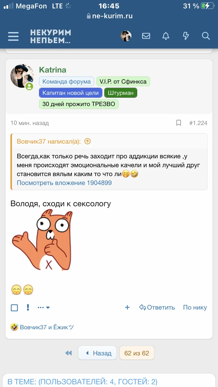 Хорошо что мы друзья ,да Жень,но ты тут как то пропадала ненадолго,я уж думал у тебя чувства ко мне возникли,хотел звонить ,говорить ,что ничего не получится у нас ,только вернись??Вовк, ты к девочкам излишнего внимания не проявляй. Ну тебя с твоей славой Синей Бороды ?