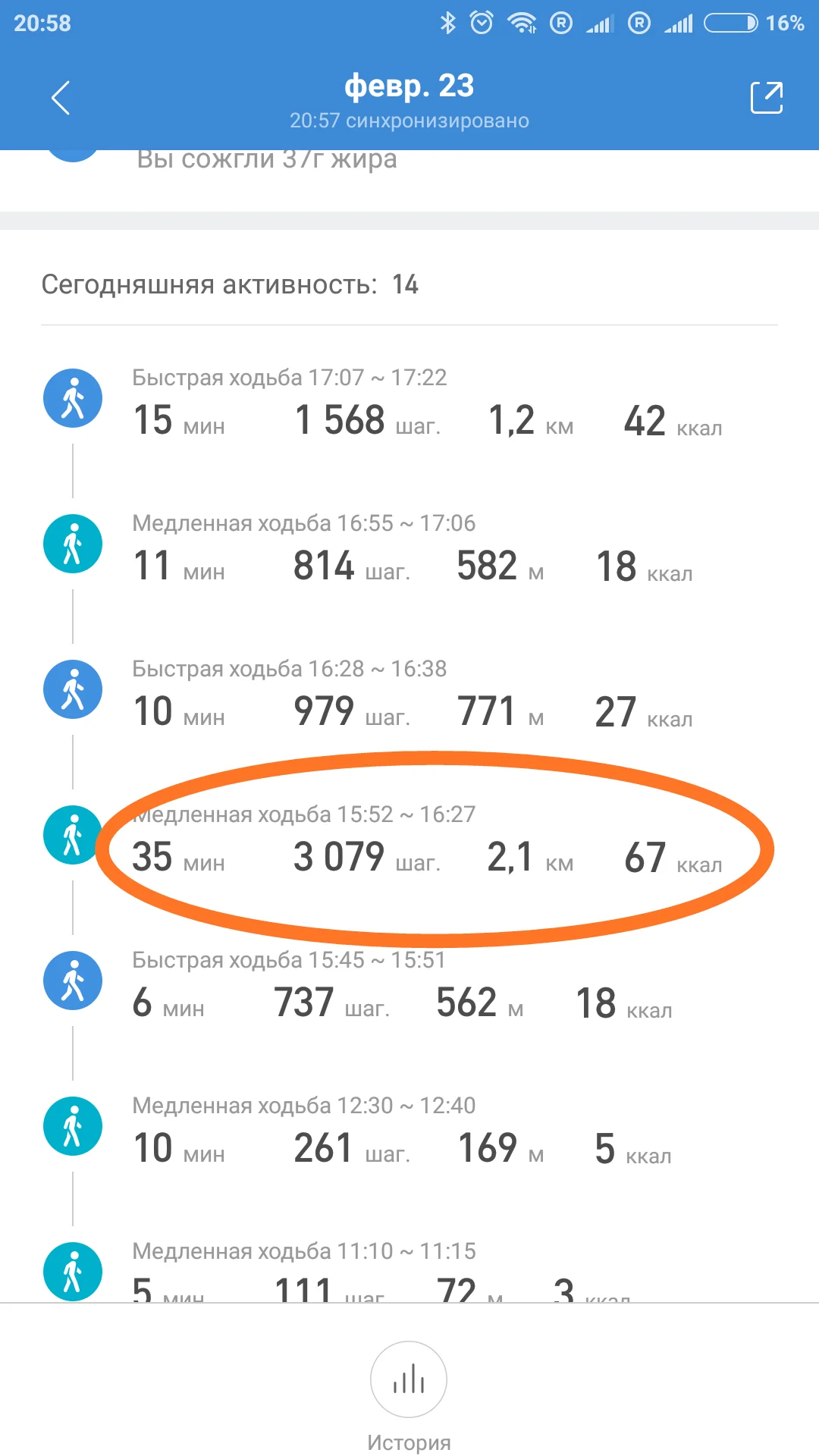 Я записал расстояние для прогулки в 35 минут, обвел.