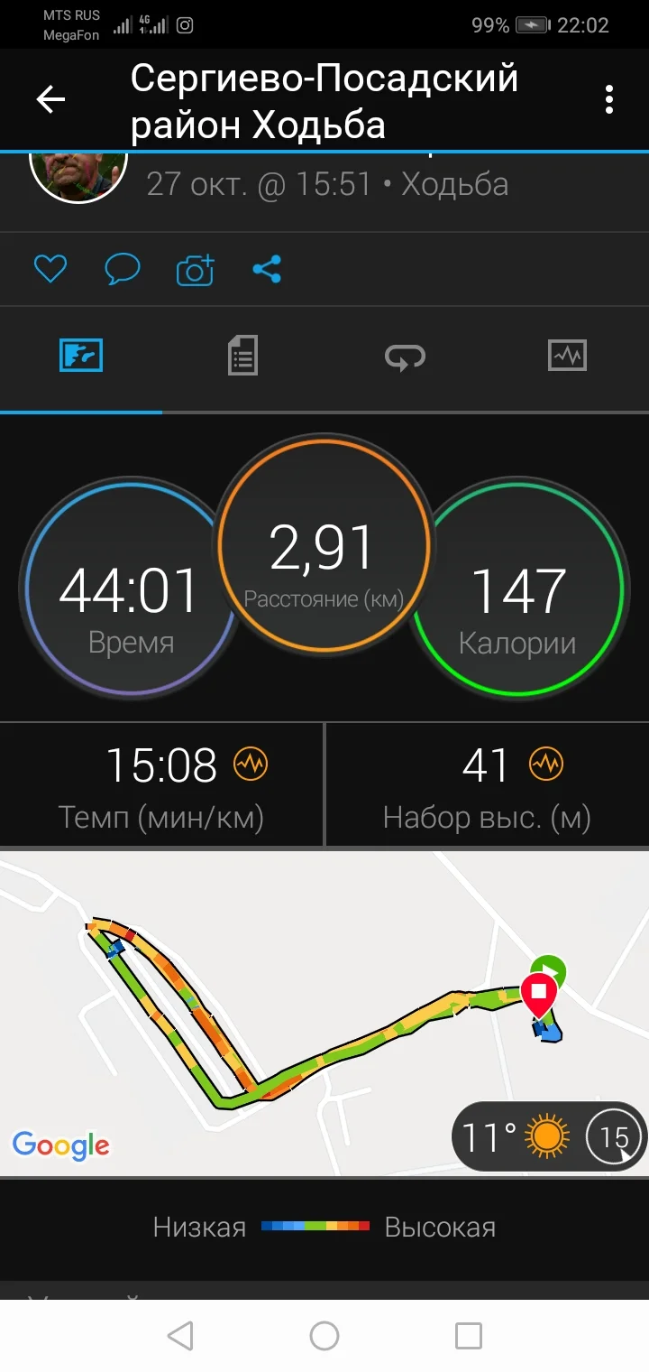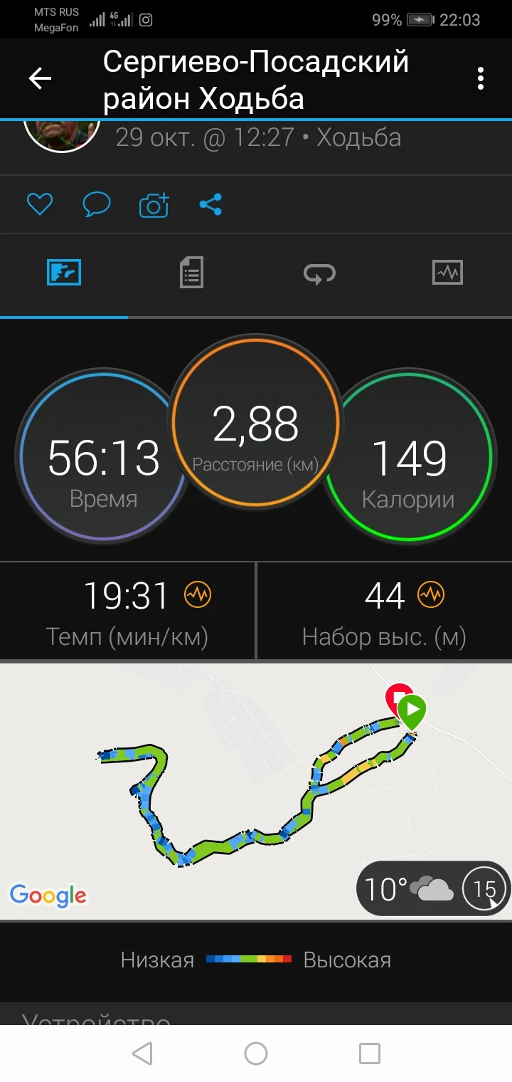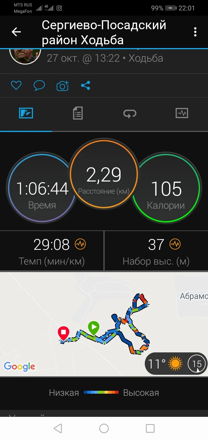 29.10.20. Ходьба 7,83 и 2,88 км. Всего 10,71 км.