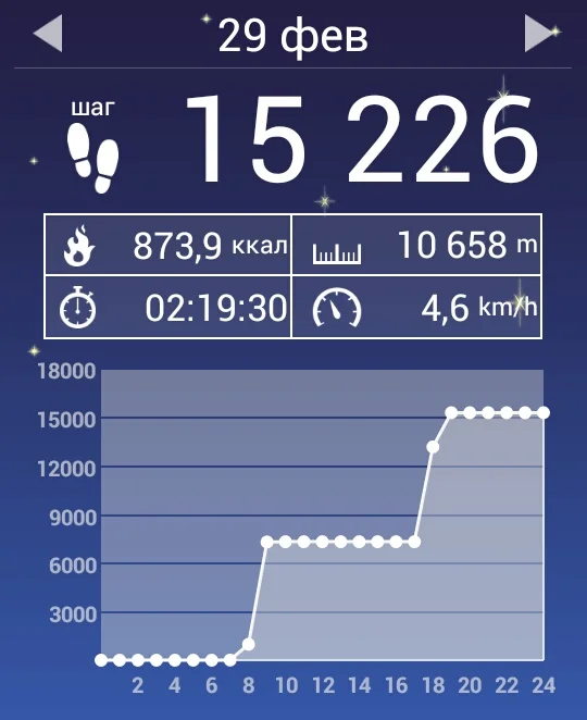 В общем отчет за 29.02 ходьба: 10,658км/2,19ч