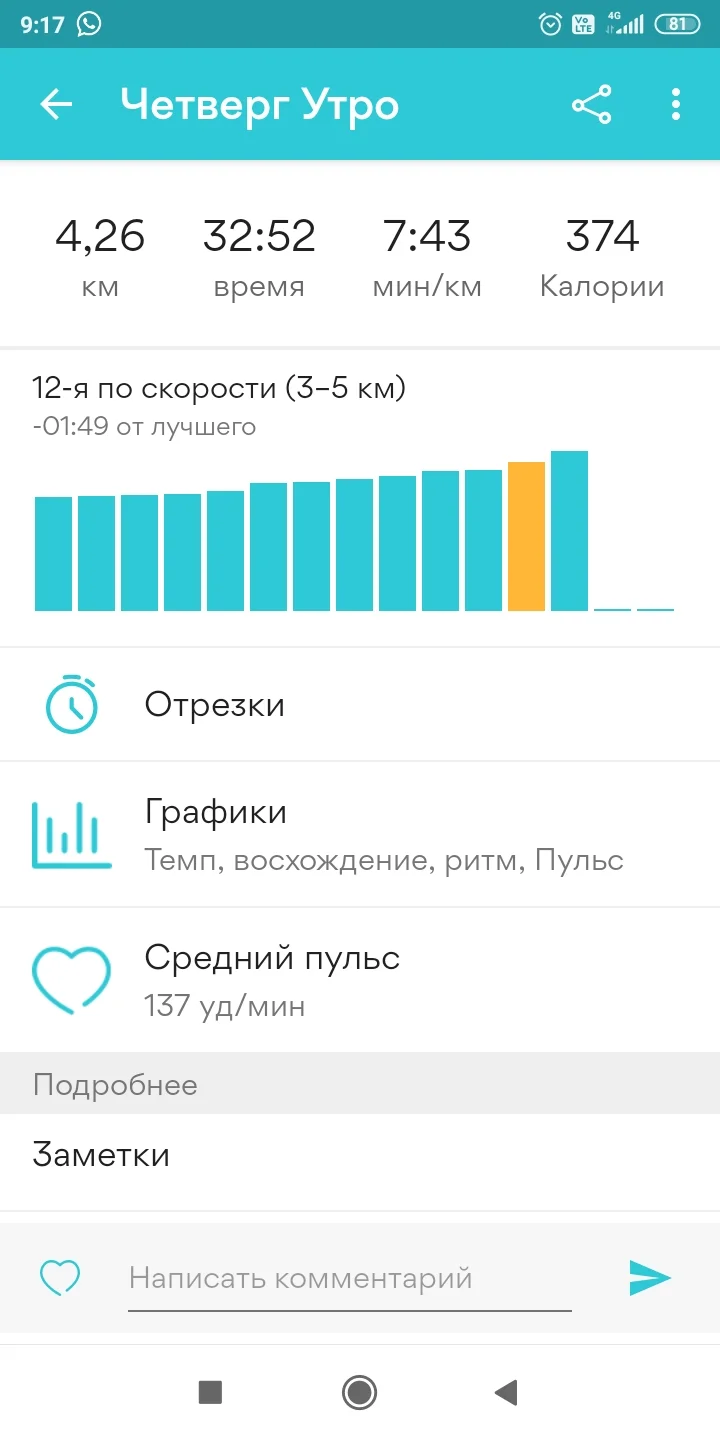 Доброе утро, 4,5 километрика по стадиону, темп 7:05. Gps опять начертил черте что)) ну ничего скоро уже будут часики у меня, цель то 10ка, близко)) всем лёгкого бега.