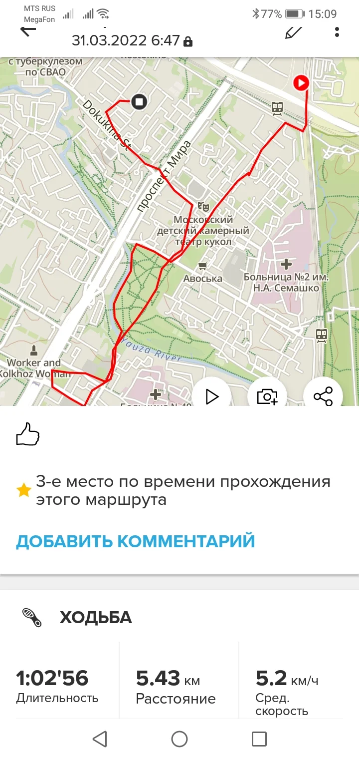 31.03.22. Ходьба 7,36 и 5,43 км. Всего 12,79 км.