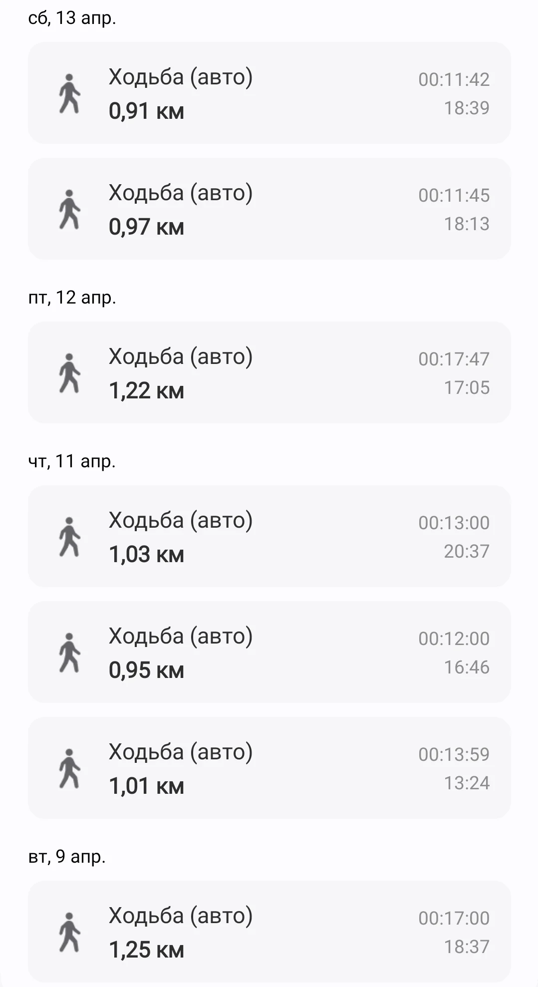 Отчёт за неделю 8-14 апреля 09.04 - ходьба, 1.25 км 11.04 - ходьба и бег, 5.29 км в сумме 12.04 - ходьба, 1.22 км 13.04 - ходьба, 1.88 км А за неделю 1-7 апреля опять отчитаться забыл. Надеюсь, я ещё не превысил лимит штрафов?