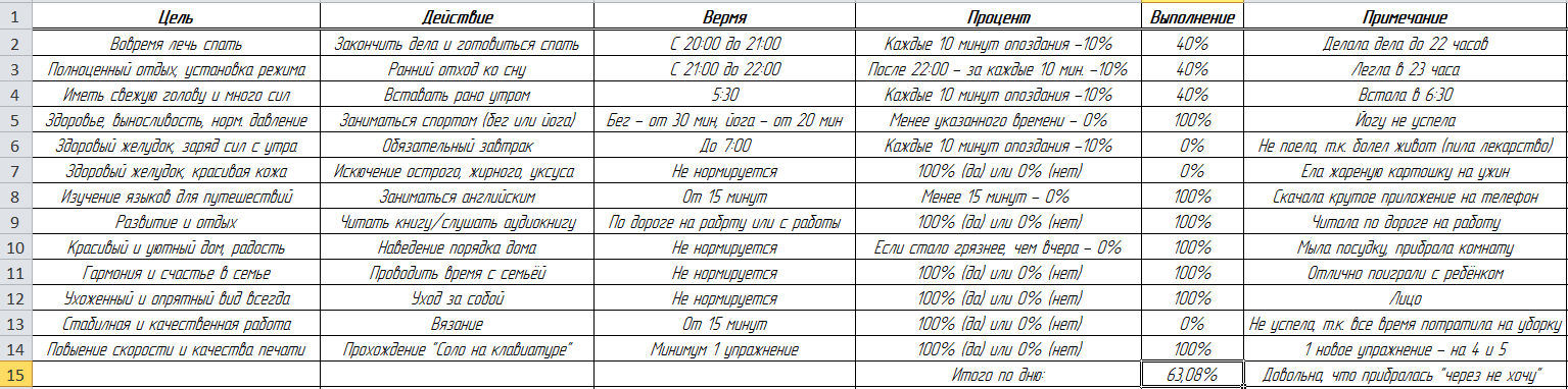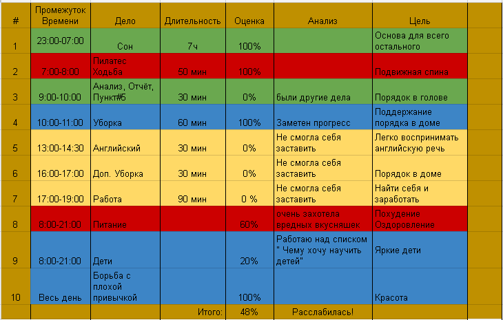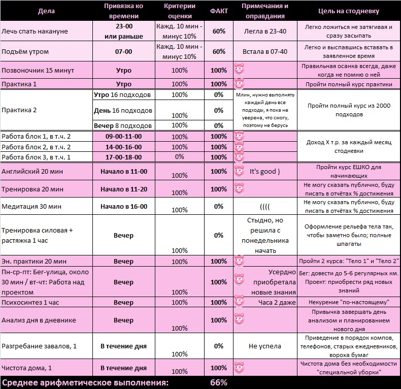 Marleanft, пункты "основы" хорошо, только 0,1 за небольшой недостаток сна, ибо это пункт, от которого зависит весь день. Красные пункты супер, не минусую за 10% по питанию, т.к. это очень хороший показатель, ранее в отчётах наблюдала меньше. Дети и красота... Красоту 0,5, дети 0,3, т.к. работа над списком немного была, хоть и недостаточно. И жёлтый пункт работы 0,3, важный пункт, касаемый самореализации, это очень нужно, хочу видеть по нему прогресс.