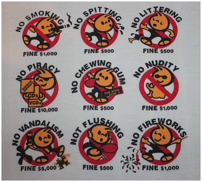 Практически на каждом шагу расставлены четкие предупреждающие знаки, рассказывающие о том, как себя вести и что нельзя делать в Сингапуре.