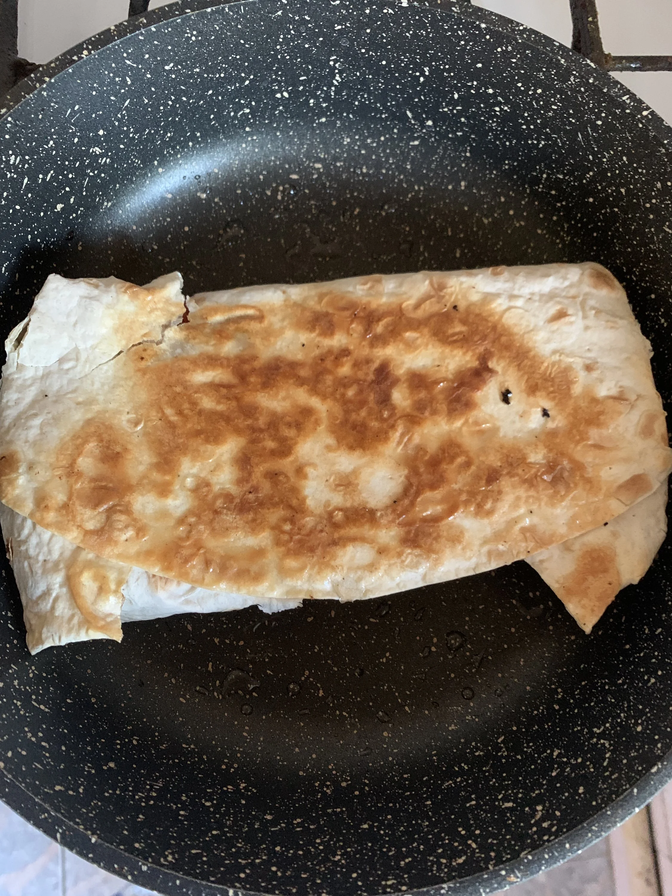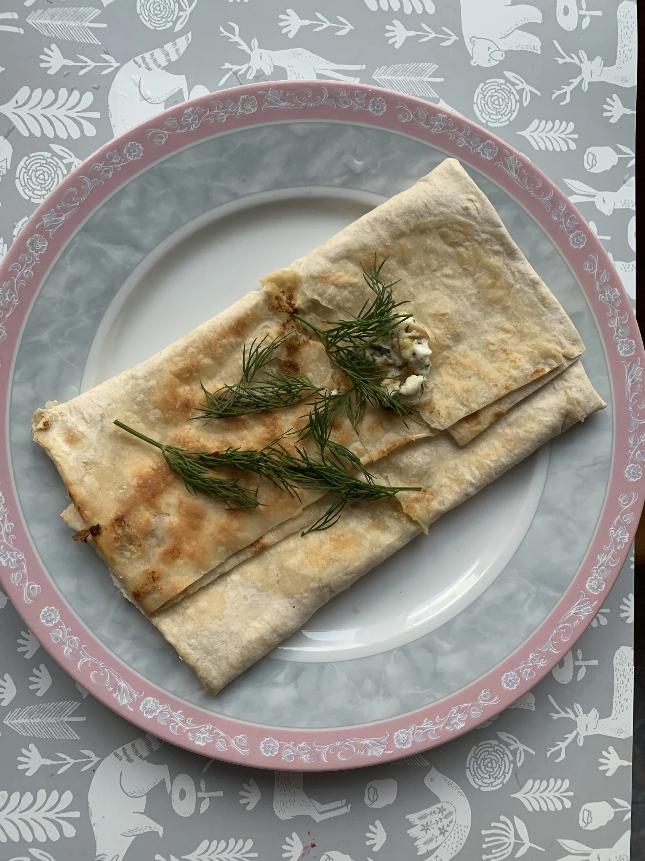 На промазанную жиром разогретую сковороду выкладываем лаваш. (Это растереть 3 капли масла по дну сковороды или разогретую сковороду свиным салом потереть, махнуть раза 3). Лаваш для эластичности сбрызнуть водой с внутренней стороны. На лаваш выкладываем начинку (творог 80 гр, перемешанный с чесноком и зеленью, соль и перец по вкусу). Края лаваша подворачиваем, формируя конверт. Жарим на маленьком огонёчке с 2 сторон. Надо творог термически обработать!