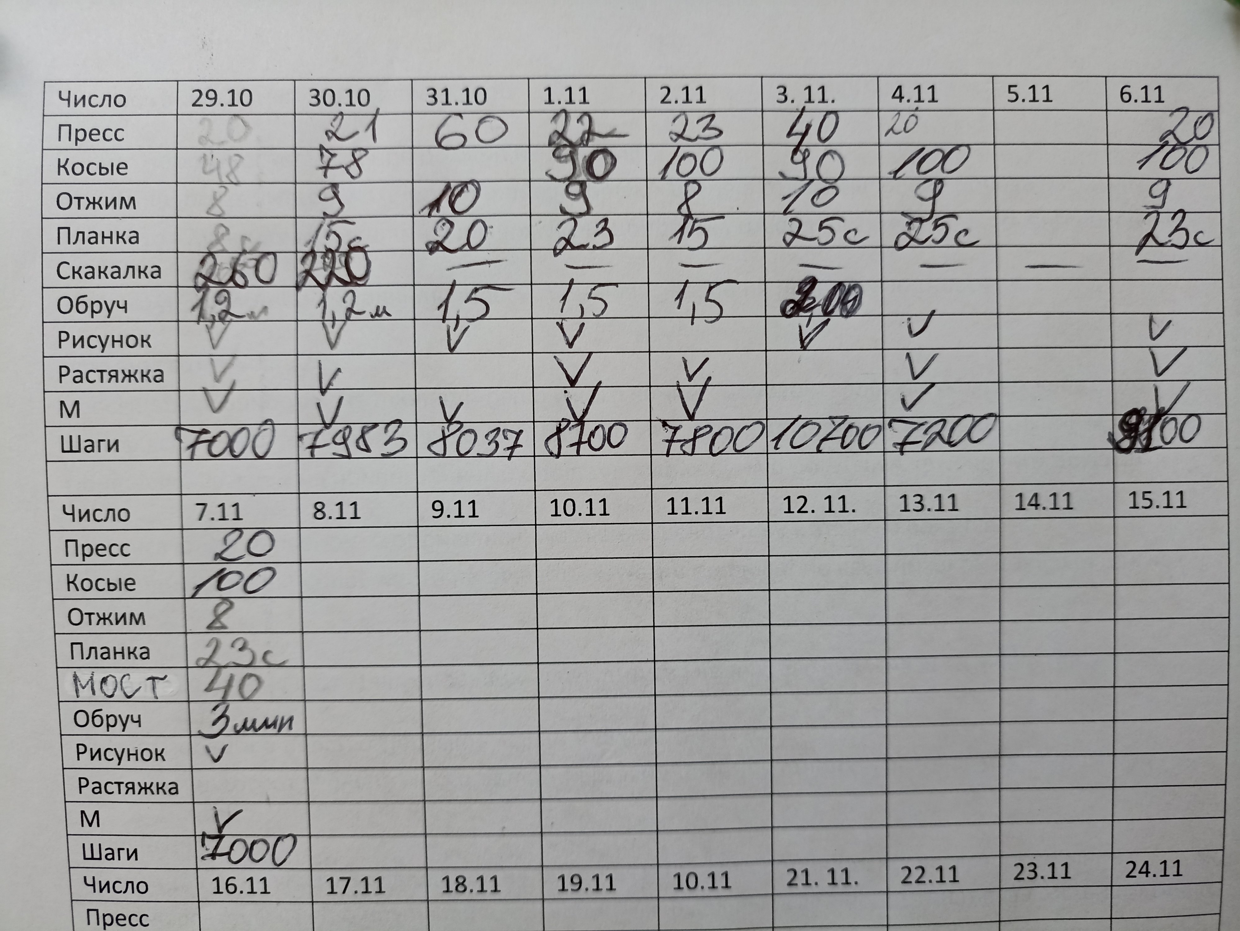 Месяц назад я начала вести таблицу, куда вписывала параметры. Недавно я завела такую же для выполнения упражнений и некоторых дел. Это дисциплинирует и показывает прогресс.
