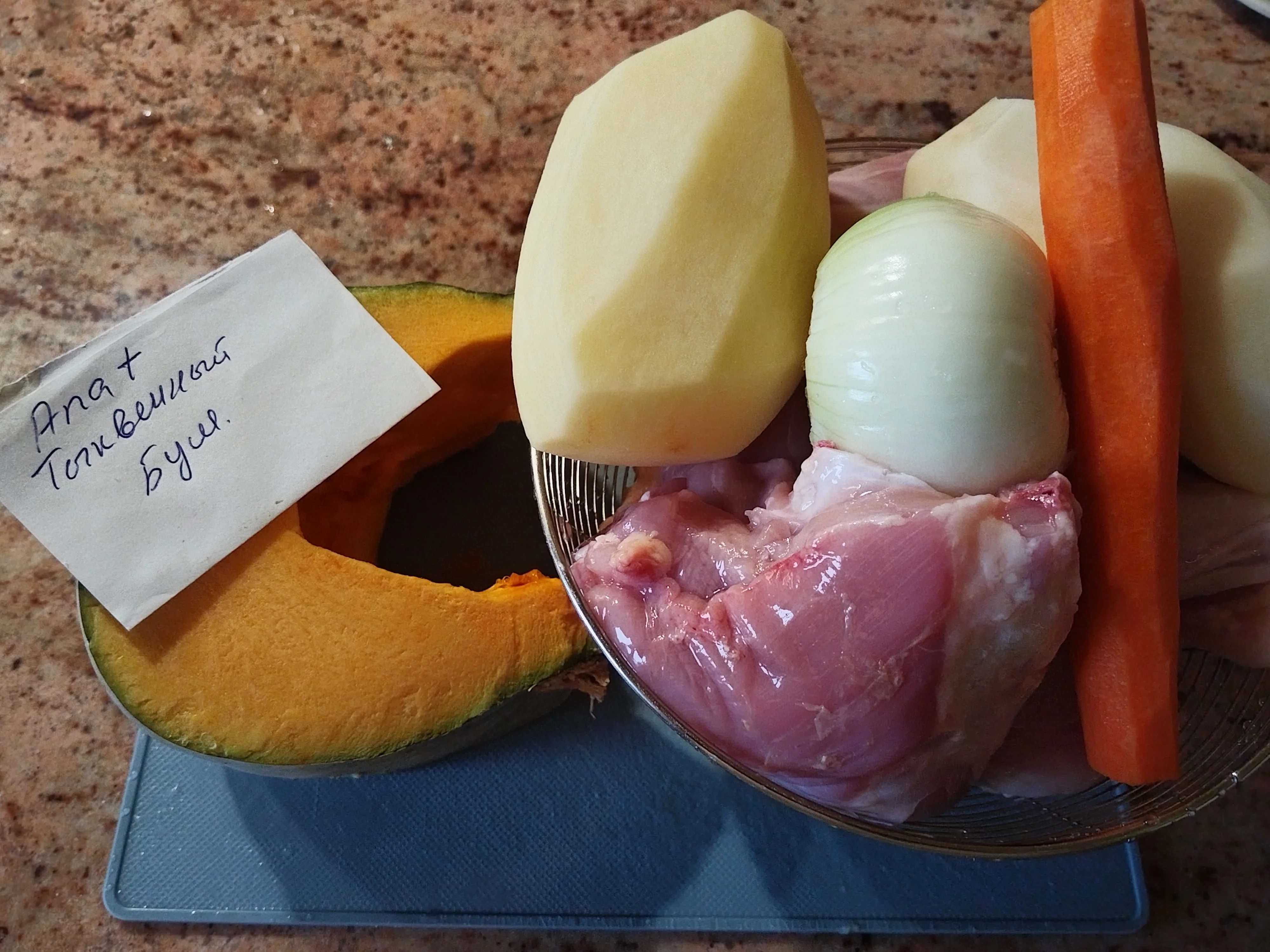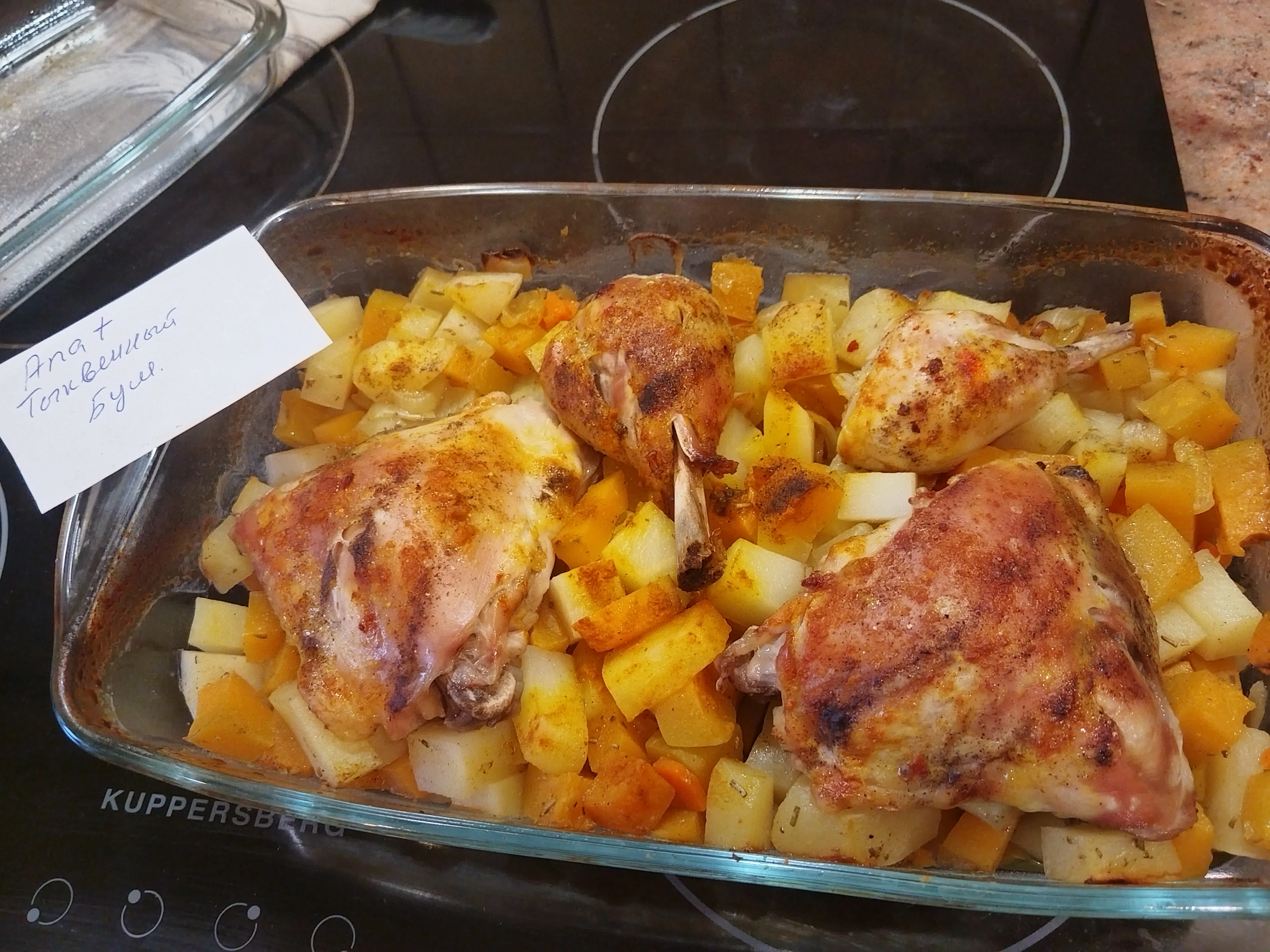аппетитненько)))ПриветствуюВсе порезать как хотите, закинуть в утятницу как хотите, специи, соль по вкусу, я добавила перец, куркума, розмарин, соль, и всё картошка, лук, морковь, тыква, окорочка куриные в духовку час с половиной на 200 в духовку