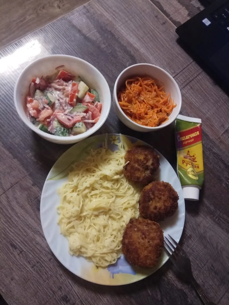 сегодня говяжьи котлетки с домашней лапшой, морковь по-корейски и салат из свежих овощей со сметаной. воскресенье - можно чуток и приготовить)))
