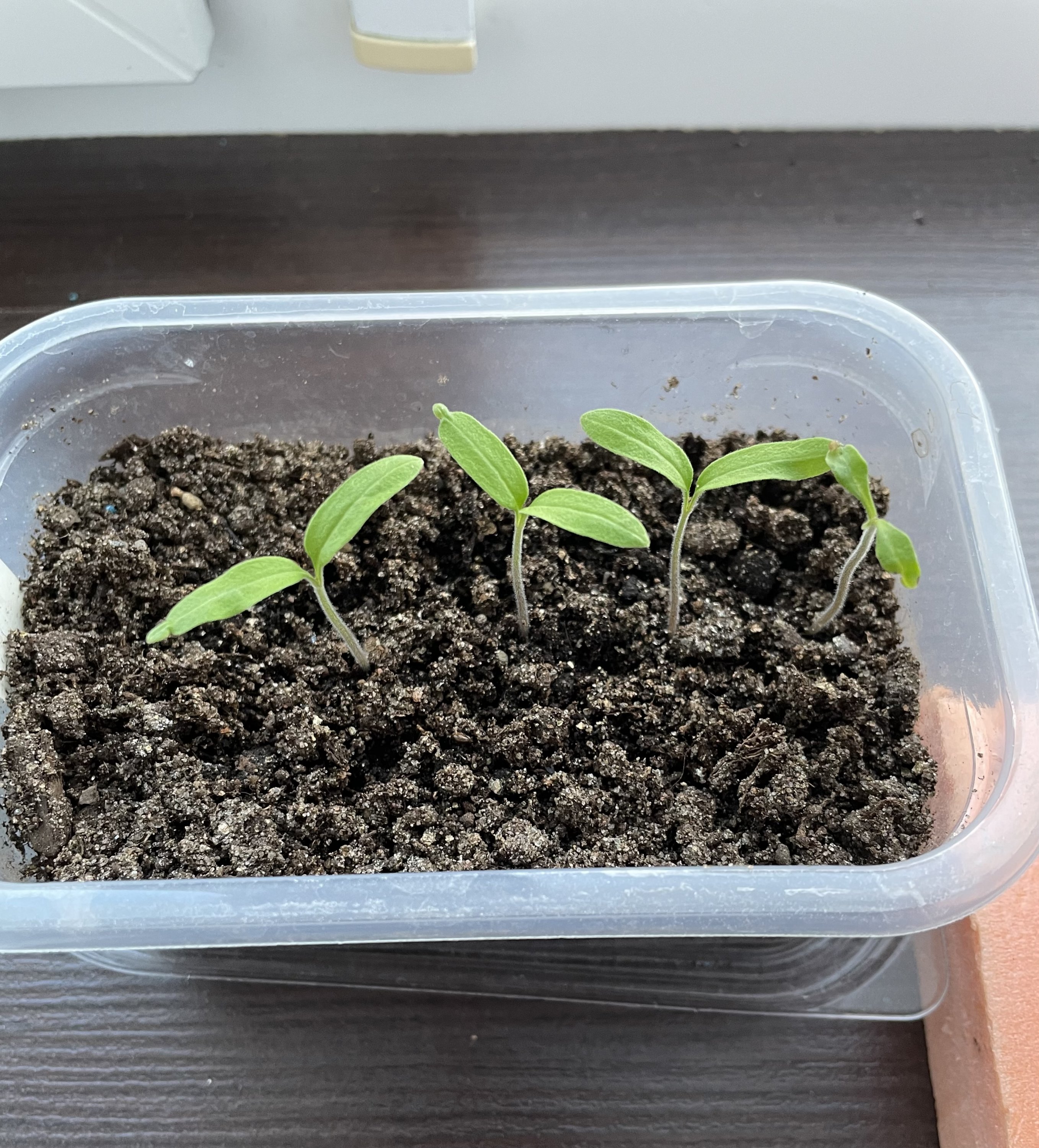 Базилик взошел дружно, но настоящие листочки выпускает очень долго.