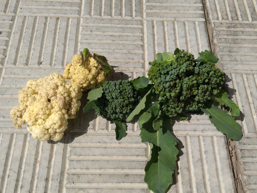 Попался один странный сорт цветной капусты. Она и не выросла ещё, а уже цветет мелкая. Заодно брокколи таких же мелких срезал (для них это нормально). На ужин будет капуста в тесте)