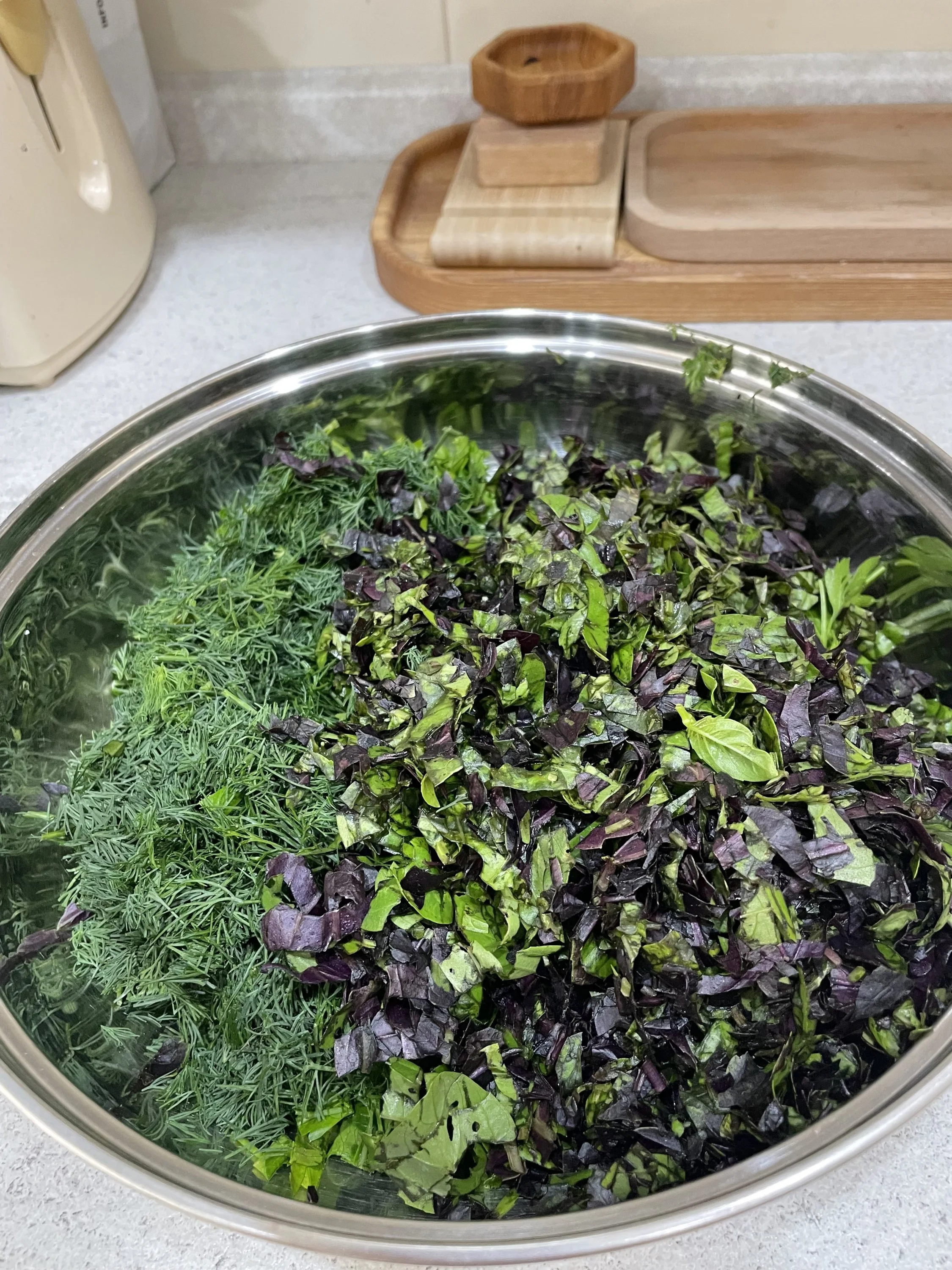 Пока варится основа соуса режем зелень.