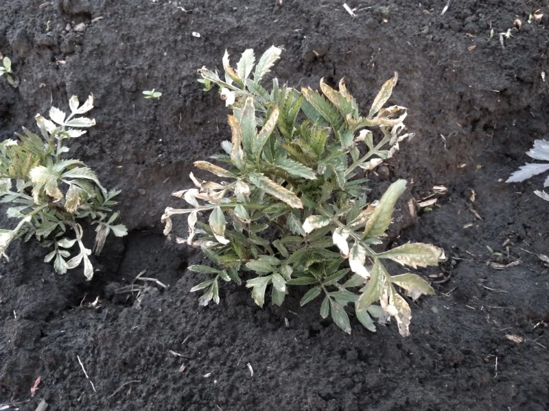 @Сладкая Булочка вот бархатец попавший под заморозок, но выдержавший его. Кончики листьев побелели и засыхают. (Снимал все вечером, цвета не совсем естественные)
