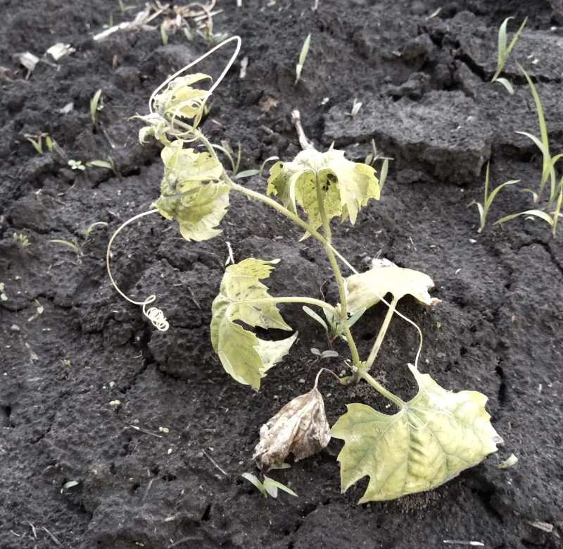 А это несчастная момордика, вся скрученная и побелевшая. Она была в небольшом парничке иначе бы не выжила. Но видно, очень хорошо видно, что теплолюбивая, чрезвычайно страдает без тепла.