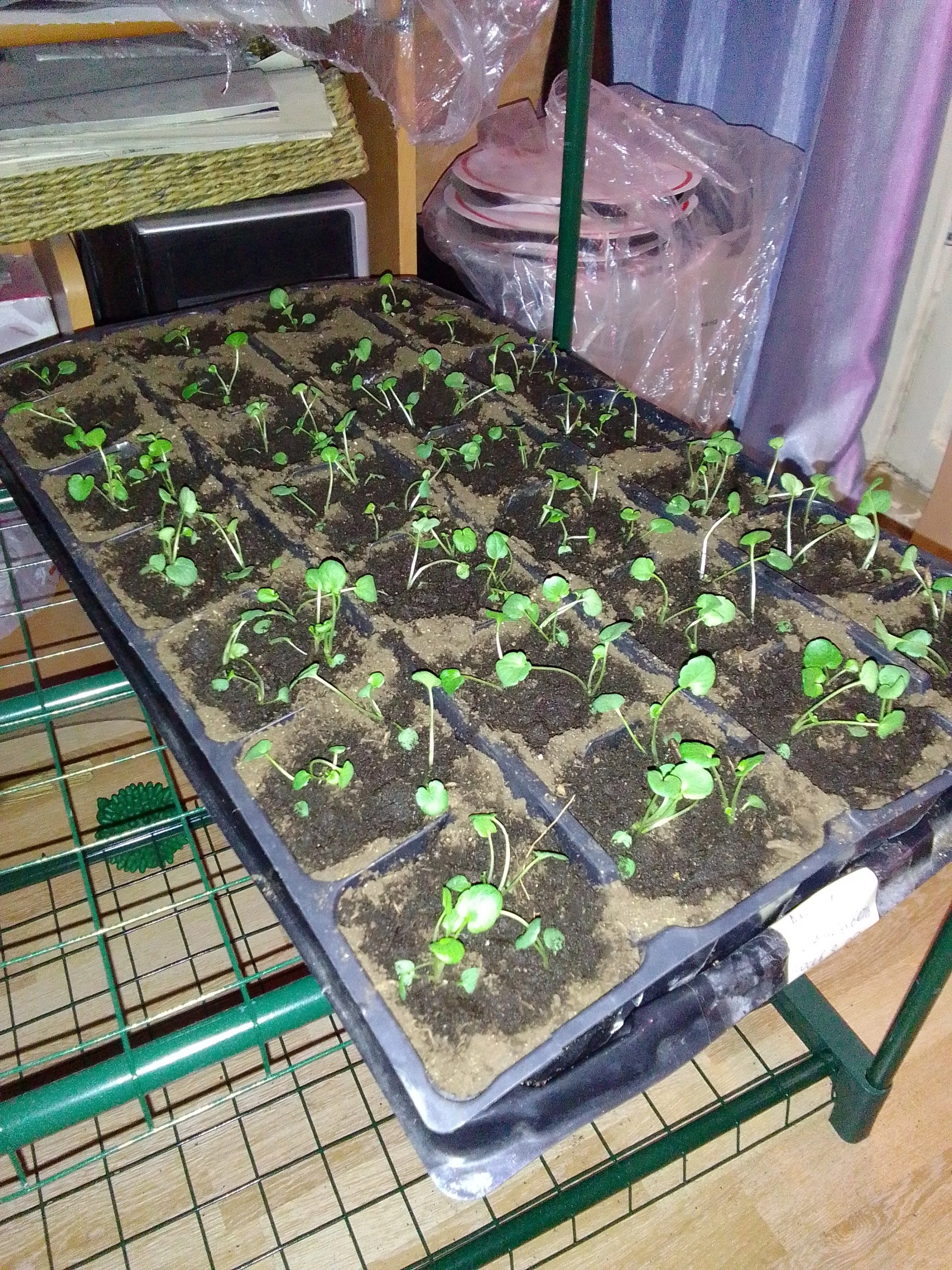 Два тазика виолок распикировала. Сверху бархатцы, стоит стойка посреди комнаты, они света хочут.