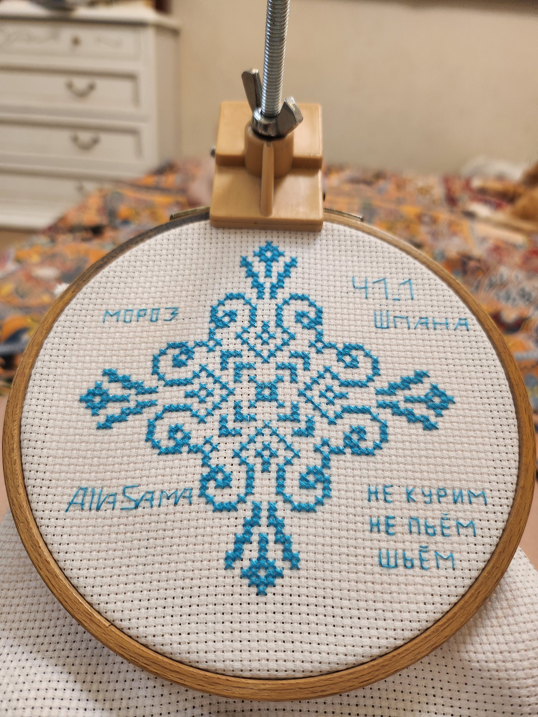 Остались вопросики:Алла, ты молодец, хорошая работа! Снежинка очень красивая, ну а подпись просто волшебная - Не курим, не пьем, шьем! Вышивка принимается!Да, иглы в корпусе от зажигалки.Посмотреть вложение 2090590Посмотреть вложение 2090591Посмотреть вложение 2090592