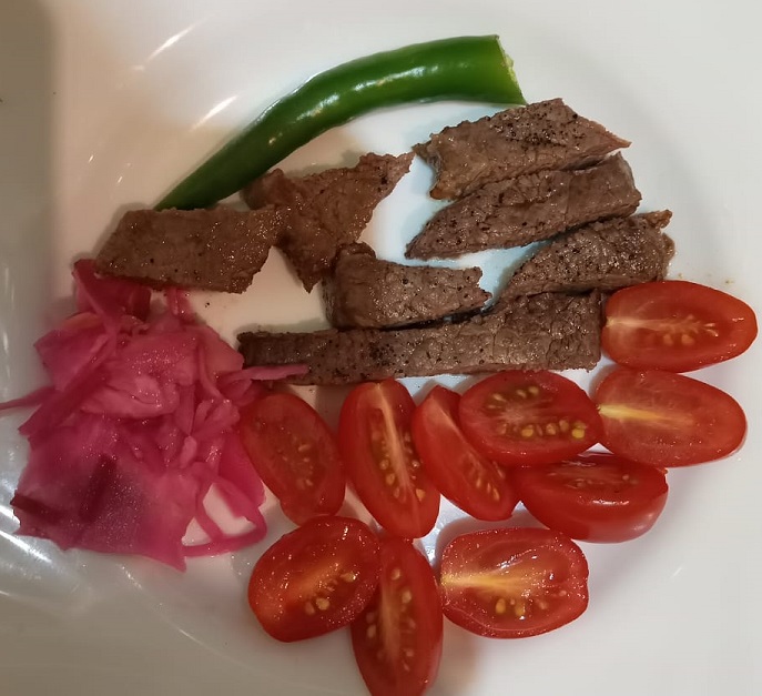 Авторское блюдо "Зов холостяка". Пеппер Стейк, маринованая капуста по-грузински, помидоры черри располовиненные.Что-то как птичка